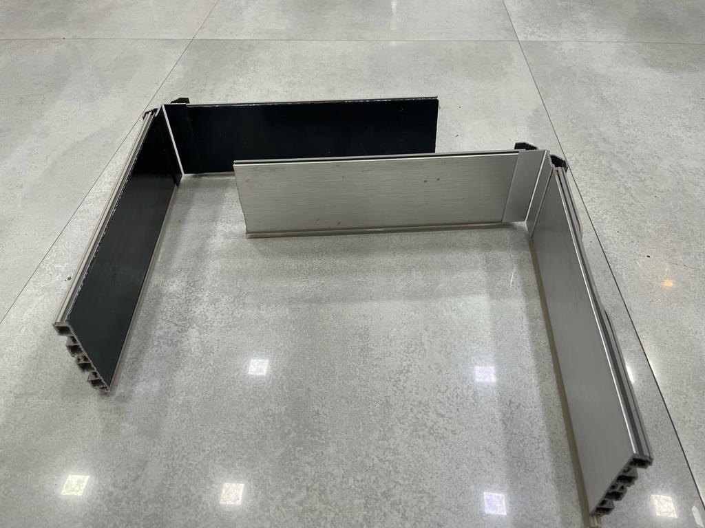 EH-SB100-BR-SV+PVC Aluminum + PVC Corner Bracket Kitchen Cabinet Skirting Board Measurement : W:37.50*H:26.10MM Material : Aluminum + PVC Finish : Silver, Black